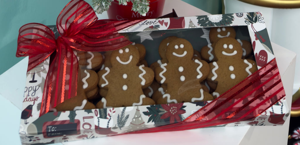 Our holiday-perfect gingerbread men come beautifully packed in a festive window box and finished with a bold red ribbon. Each cookie is soft, spiced, and hand-decorated with classic white icing—smiling, cheerful, and ready for gifting. A sweet, charming treat for friends, teachers, coworkers or anyone who deserves a little holiday joy.