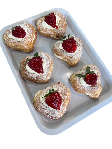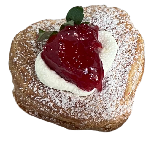 Our traditional baked zeppole shell shaped as a heart with a deliciously light chantilly and fresh strawberry filling